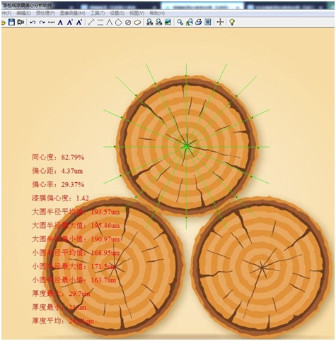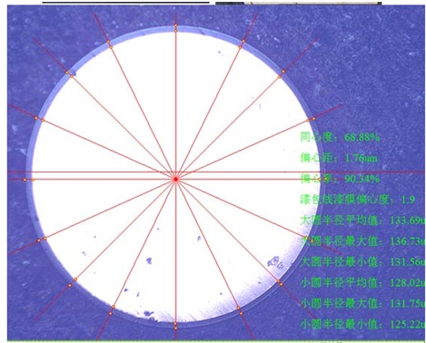 根據試樣的形貌,尺寸等等選擇對應的顯微鏡物鏡進(jìn)行成像,使用漆包線(xiàn)漆膜偏心度分析軟件測量其偏心度數據并進(jìn)行檢測報告輸出;