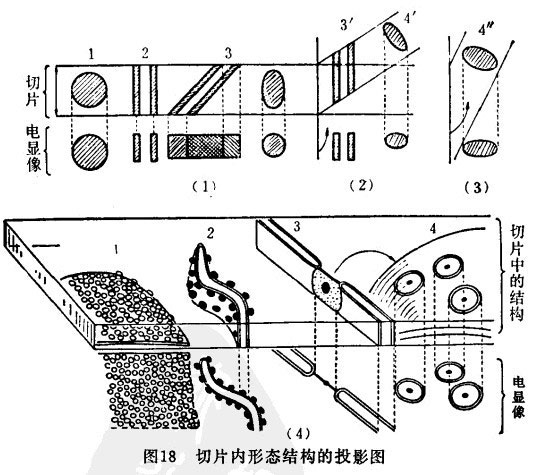 圖18是最常見(jiàn)的電鏡像,也是人們在判斷上容易產(chǎn)生問(wèn)題的地方,(1),(2)容易判斷,在(3),(4)的情況下正確辨認就很不容易。用樣品傾斜副件使樣品傾斜后觀(guān)察結構形態(tài)的位置,由于傾斜度的關(guān)系而呈(2), (3)的樣子??傊?,還可以與正確的圖像近似,根據經(jīng)驗可以判斷是折斷、縱斷還是橫斷。但是,有時(shí)必須借助于傾斜副件如(4)中的有粒內質(zhì)網(wǎng)和核膜以及有窗毛細血管壁,它們的切面和原來(lái)結構不相同。